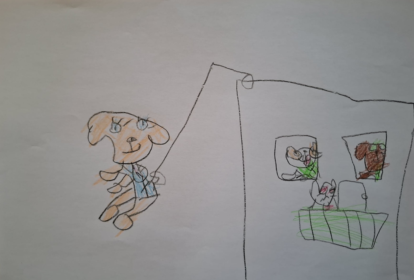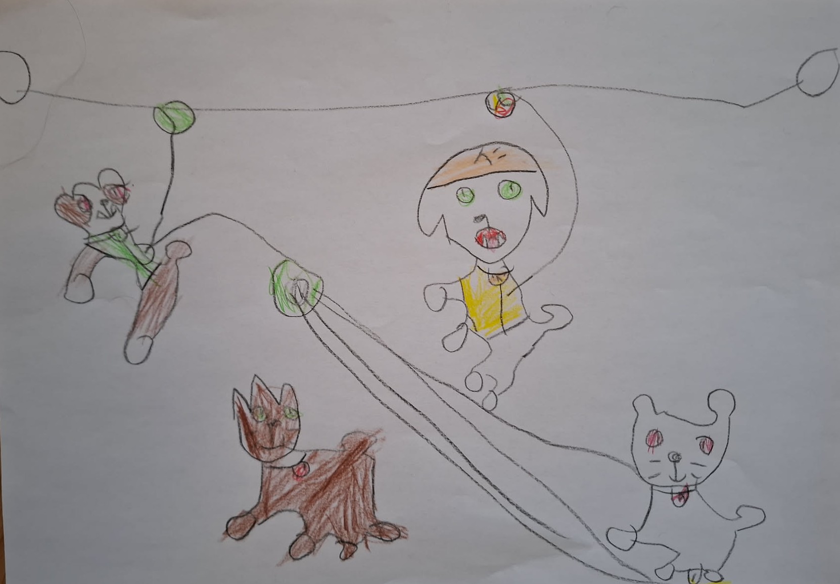 Pidal har zipline i loftet! Vuffer prutter!! I madskålen er der vand. |