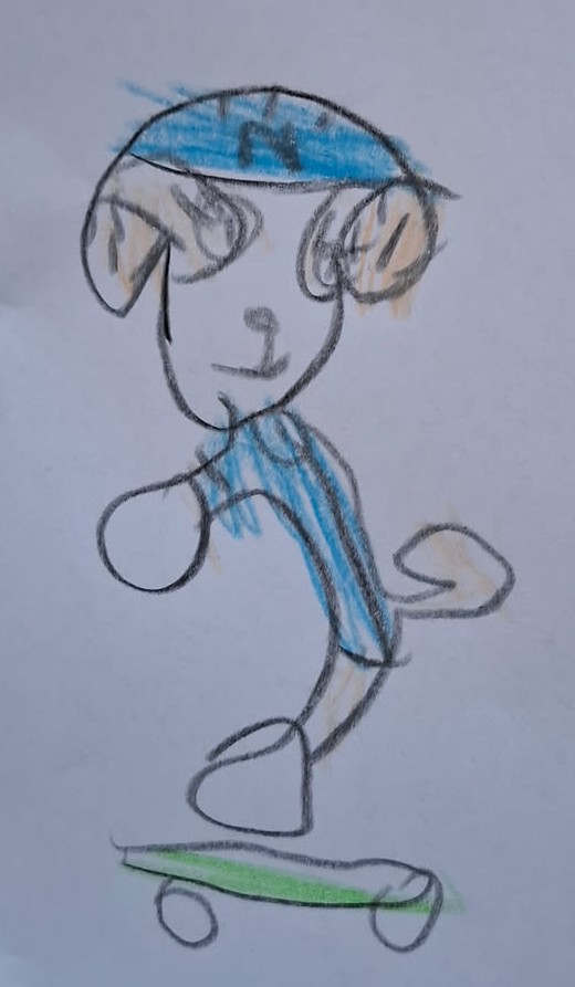 Lambi er et får. Vuffi spiller musik. Lambi har brunt tøj. Krydsi står på skateboard. Vuffi spiller musik. Lambi er hvid.